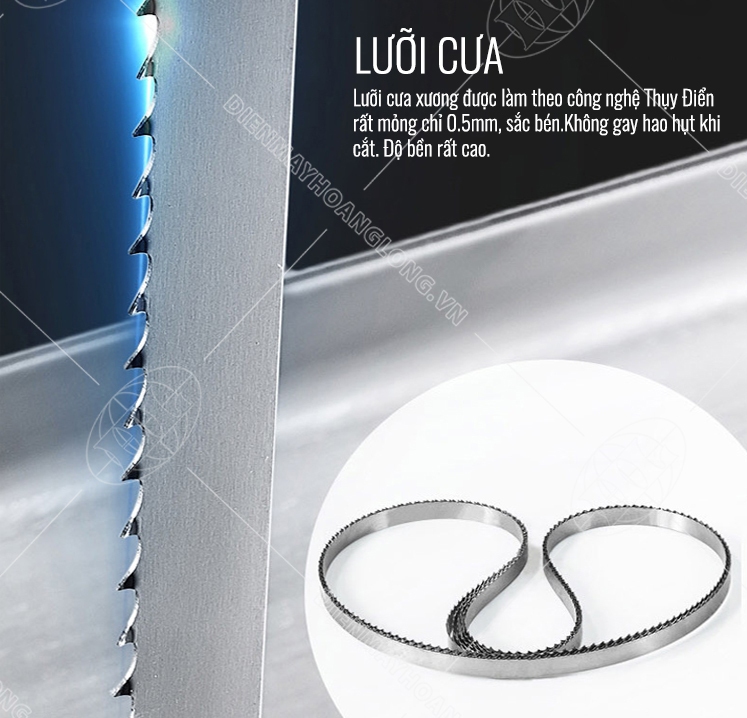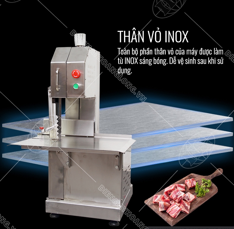 - Lưỡi cưa dài 1650mm: Lưỡi cưa bằng thép cứng nhập khẩu, dễ dàng cắt qua các loại thực phẩm từ thịt đông lạnh, cá đến xương ống cứng.
