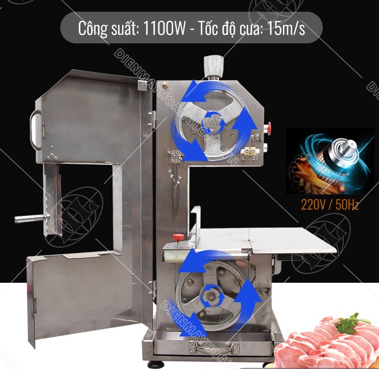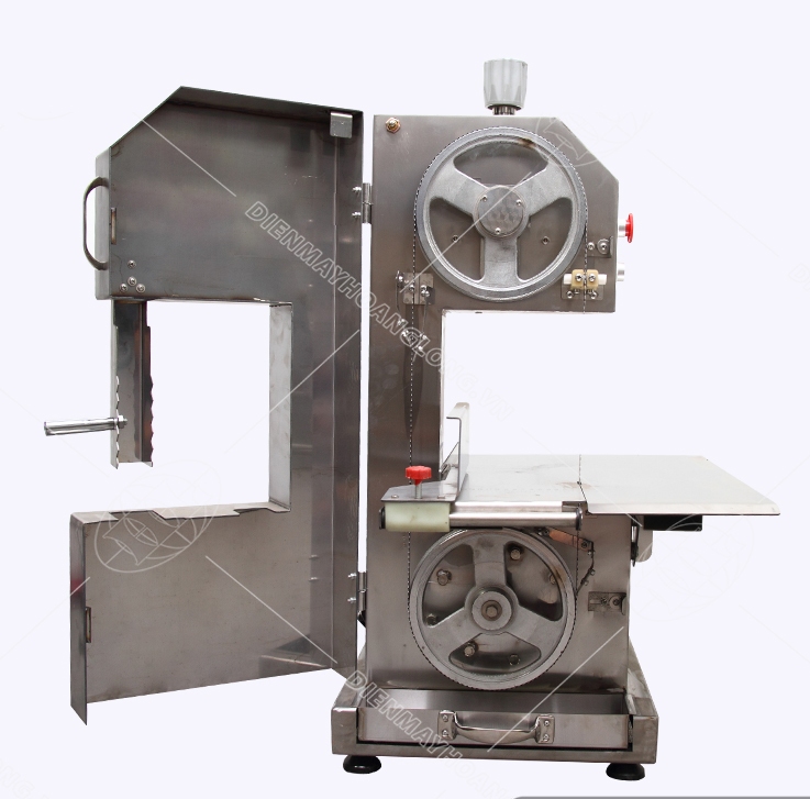 - Vận hành máy: Bật công tắc, dùng cần gạt để đẩy thịt hoặc xương vào lưỡi cưa, thực hiện cắt nhanh chóng.