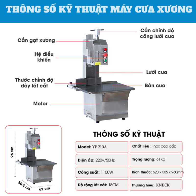 Máy cưa xương F210a được trang bị với động cơ công suất lên tới 1500W được quấn hoàn toàn bằng dây đồng, giúp tuổi thọ của máy lâu dài – lưỡi cưa bằng thép cứng nhập khẩu – kích thước dài của lưỡi cưa 1650MM, kích thước dài giúp cho quá trình vận hành cắt được các khúc thịt cao, lớn và to.