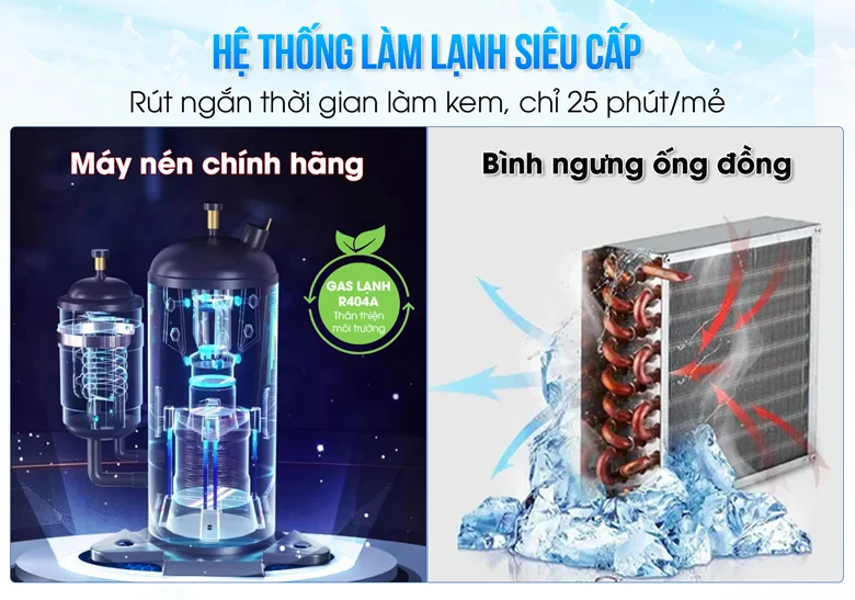 Trong đó, máy nén chất lượng cao của Trung Quốc mang lại hiệu suất ổn định và làm mát nhanh chóng. Thiết bị ngưng tụ hoàn toàn bằng ống đồng nguyên chất, không rò rỉ và tốc độ tản nhiệt nhanh, đều. Đặc biệt, máy còn sử dụng gas R404a làm môi chất lạnh, một loại gas tiêu tốn ít điện năng, được các nhà sản xuất thiết bị và máy nén hàng đầu trên thế giới tin dùng.