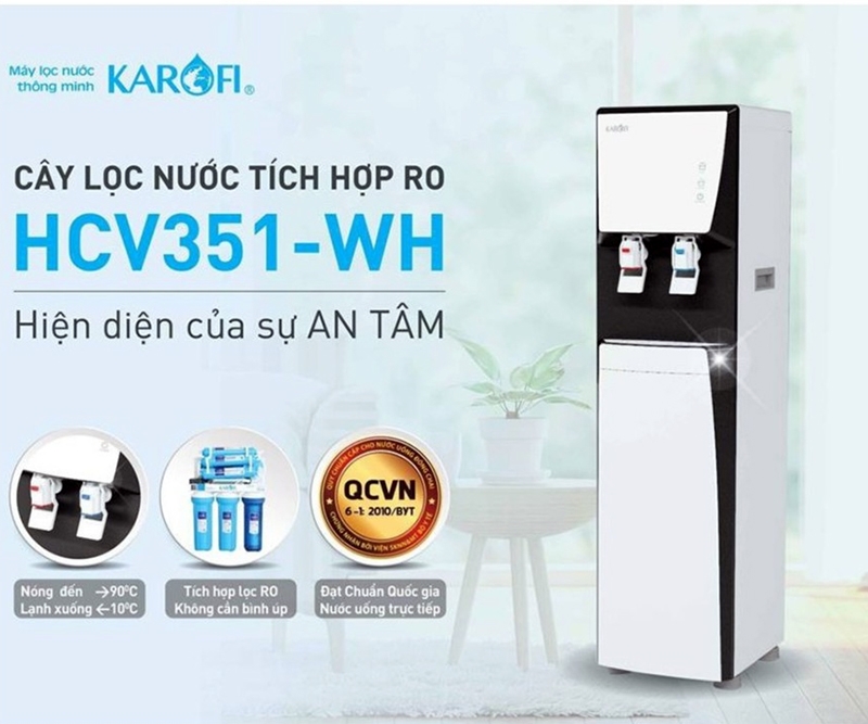 Máy lọc nước RO nóng lạnh 2 vòi KAROFI HCV351-WHthương hiệu KAROFI được bán chạy nhất trên các hệ thống siêu thị điện máy và cửa hàng gia dụng trên toàn quốc