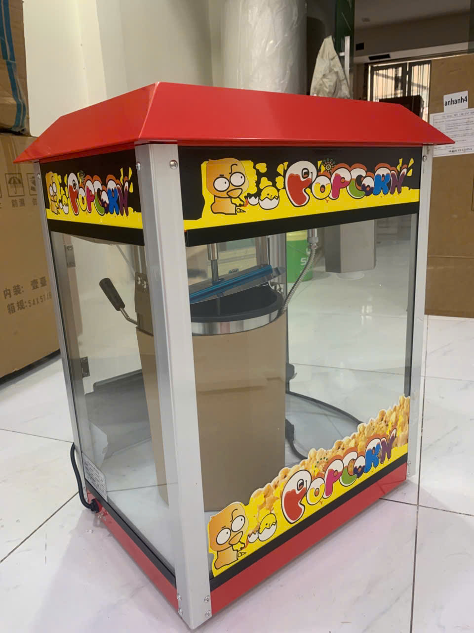 - Thiết kế khung nhôm và sắt chắc chắn: Máy nổ bắp được làm từ khung nhôm và sắt bền bỉ, với bốn mặt kính trong suốt giúp bạn quan sát toàn bộ quá trình nổ bắp.