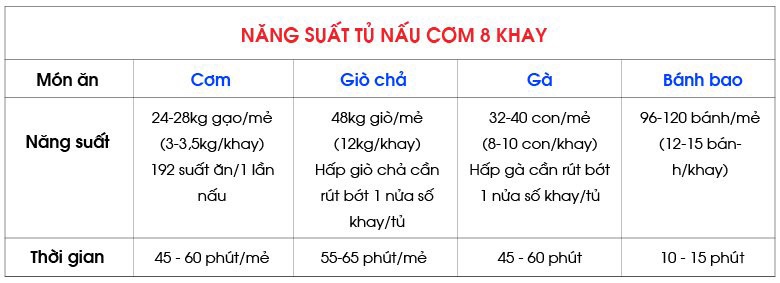 Tủ hấp cơm 8 khay đáp ứng được khoảng 120 – 130 suất ăn trong một lần vận hành, phù hợp với cơ sở kinh doanh quy mô vừa và nhỏ.